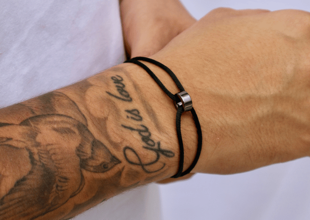 A pulseira de cetim preta com detalhes centrais em ródio negro foi criada para homens que buscam um acessório elegante, com presença, sem exageros.